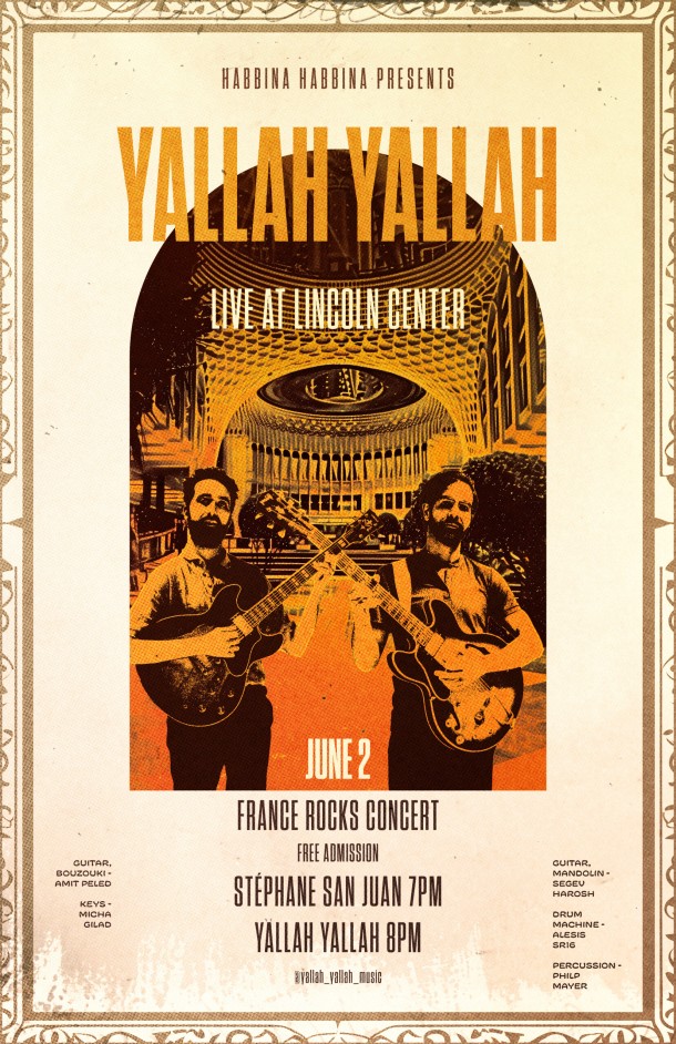 Saturday, June 2: See Israeli guitar duo Yallah Yallah supporting French jazz-fusionist Stéphane San Juan at a FREE show at Lincoln Center!